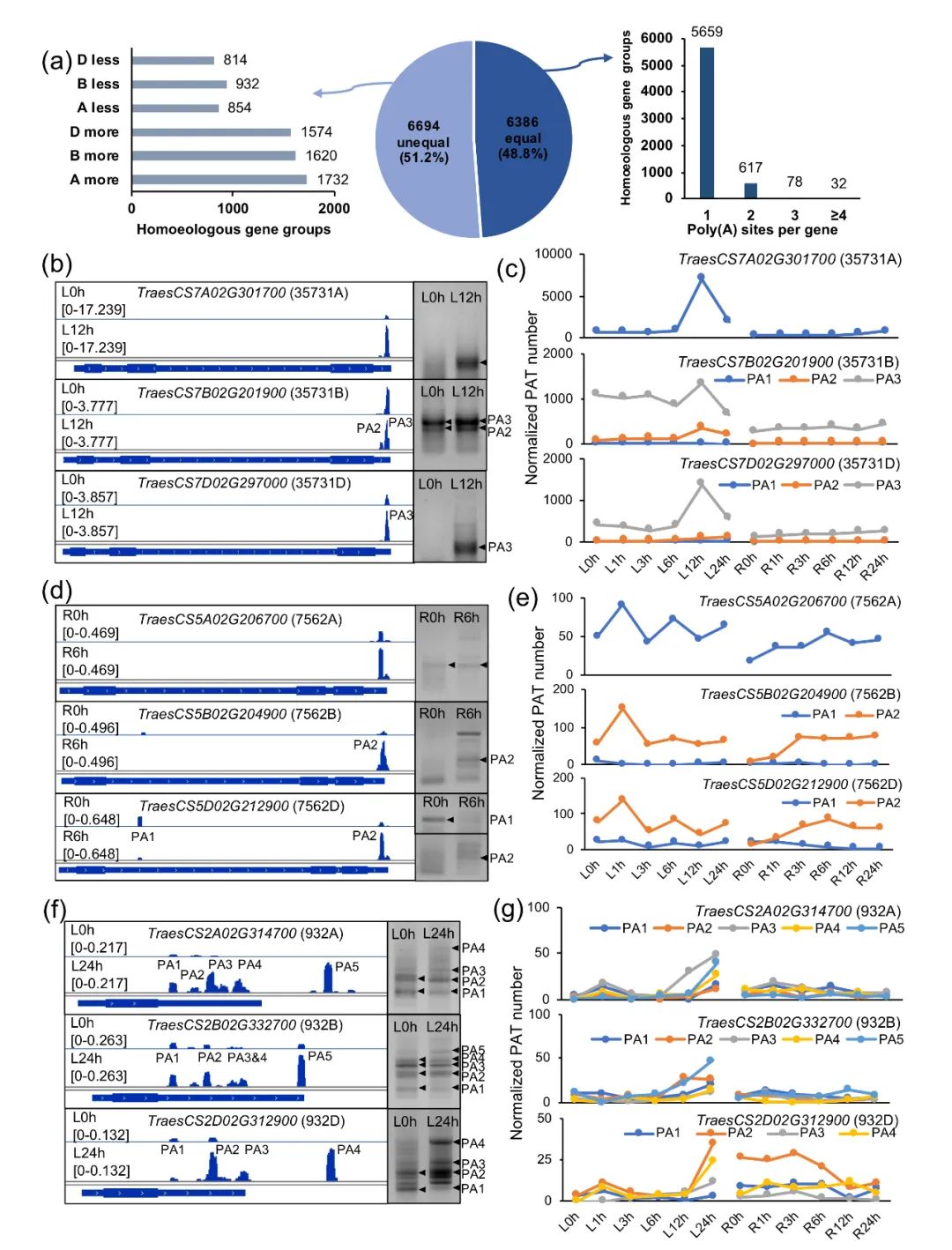 复杂基因组中多套同源基因间如何协调达到最佳效果一直是个未决问题。以小麦为例,异源六倍体小麦的基因组包含A、B、D三个亚基因组,含有大量的同源基因,这些同源基因在功能上的相似性和差异性一直令人好奇,然而多倍体作物中,特别是在共转录水平上,复杂的基因表达和调控机制仍然不清楚。APA是共转录调控的一个重要部分,在植物的生长发育和胁迫应答中发挥着关键作用。干旱是小麦面临的主要环境挑战之一,特别是在全球气候变化的背景下,干旱胁迫对小麦产量的威胁日益严峻。因此,研究干旱胁迫下小麦同源基因的APA调控对小麦抗旱遗传改良、理解多倍体基因组的表达调控具有重要意义。
