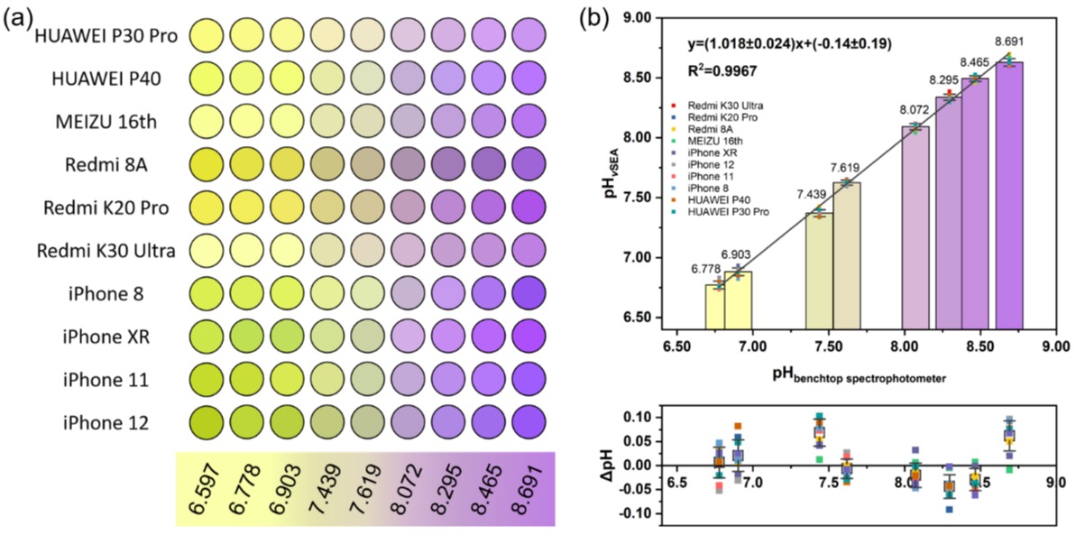 (a)使用不同型号智能手机获取的一系列相同样本的图像;(b)不同型号智能手机对pH测量的影响