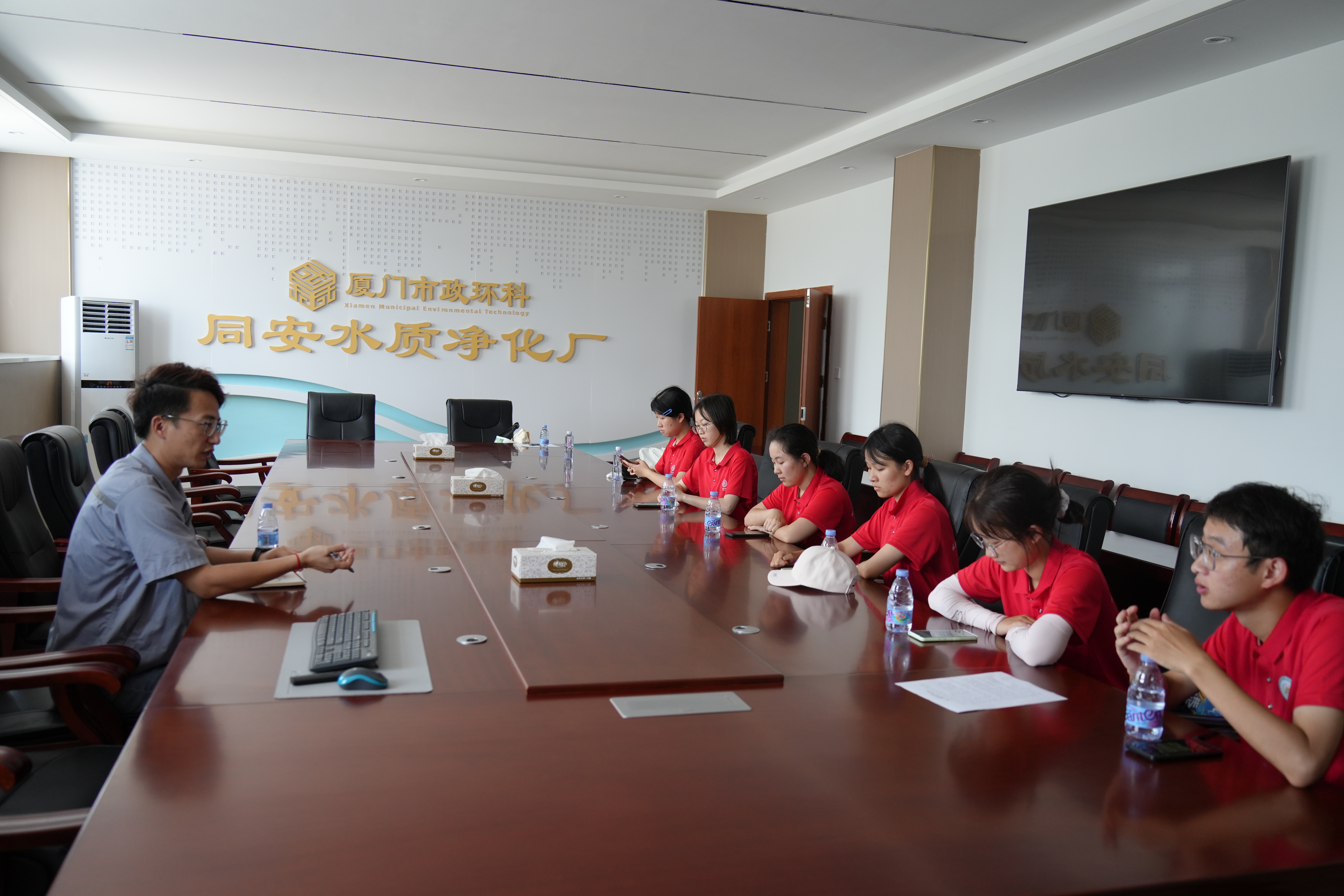 参观结束后,时间队员们与水质净化厂主任江慕一同来到会议室进行了访谈。江慕表示,同安水质净化厂主要处理的污水主要来自生活污水,也有一部分来自工业污水。处理后的水一部分会被用于埭头溪上游的生态补水,以改善该地区的水质。随着净水厂的不断发展,之前黑臭的水体现在变得清澈透明。绝大部分经过处理的水都用于生态补水,只有少部分用于绿化和浇灌。江慕表示:“污染程度的变化是非常明显的。近几年,生态环境局对污染源的整治也有了很大的改变。”这次访谈让实践队员们切身感受到了科技的力量,对保护水资源的重要性有了更进一步的认识。