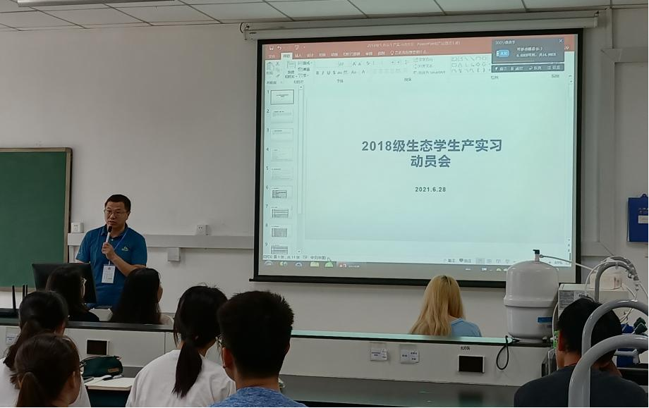 6月28日上午, 2018级生态学专业本科生班级在金泉楼C115召开生产实习动员会,带队教师林清贤主持本次动员会,副院长王文卿、生态学系副主任卢豪良、生态班班主任周晓平以及实验中心教师刘珺、段静静、辅导员王安胜出席会议。