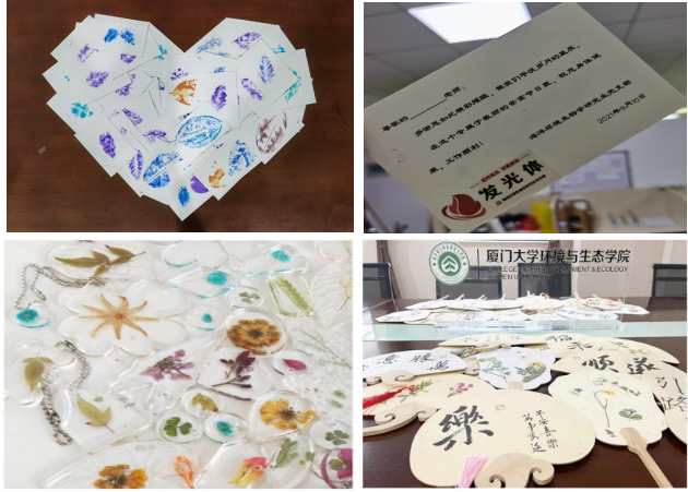 习近平总书记强调“绿水青山就是金山银山”。在贯彻绿色发展理念的指引下,支部挖掘专业特点,大胆创新形式,向老师们传达敬意和感激之情。回首过去4年,学生党员们在校内收集枯树叶,通过墨水拓印,将大自然的脉络转化为126份独特的教师节礼物。他们还通过滴胶和叶拓的方式制作植物琥珀、叶拓贺卡和环保袋,将植物美的瞬间永久保存。2023年,学生制作植物压花扇子,将艺术与环保完美结合,每一片压花都是对自然美的赞颂,每一次扇动都是对老师传道授业的感激。这些活动一脉相承,既是一份送给老师的特殊礼物,也是环生学子们对专业的热爱,更传达了环保、生态、自然的理念。